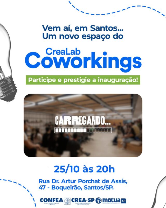 O Crea-SP Coworking em Santos será inaugurado neste sábado, 25 de outubro, às 20h00, na Associação de Engenheiros e Arquitetos de Santos.